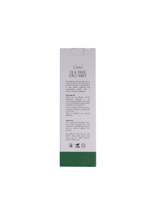 DermaRestore Tea tree deo mist is a natural solution for body odor. It contains Tea tree oil and Vitamin E to give all-day protection and non-irritating results, with a pleasant & natural fragrance.